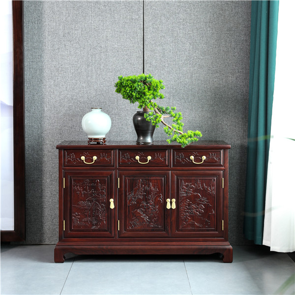 鼎順紅木餐邊柜的整個(gè)柜體由優(yōu)質(zhì)紅酸枝精心制作而成,再配以細(xì)致的雕刻,富有中國傳統(tǒng)文化氣息,且有收納、裝飾的作用。