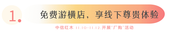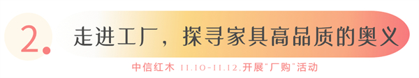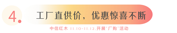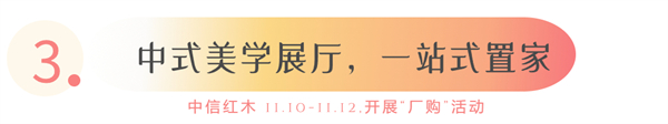 更多活動(dòng)優(yōu)惠等你現(xiàn)場(chǎng)解鎖,具體可咨詢線下門店。11月10日至11月12日,中信紅木期待您的到來!
