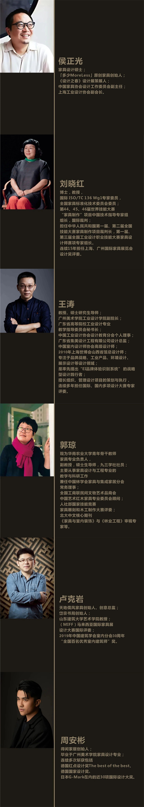 本屆大賽初賽評審擁有大咖級評委陣容,大賽由:「多少MoreLess」原創(chuàng)家具創(chuàng)始人侯正光;第44、45、46屆世界技能大賽家具制作項目中國技術指導專家組組長、金牌教練劉曉紅博士/教授;廣州美術學院工業(yè)設計學院副院長王濤教授;華南農(nóng)業(yè)大學郭瓊副教授;天地儒風家具創(chuàng)始人、創(chuàng)意總監(jiān)盧克巖;得閑家居創(chuàng)始人周安彬聯(lián)袂組成初賽專家評審團,以保證評審工作的公平公正。大賽專家評委將用各自在藝術領域的建樹和影響力,為本次大賽提供國際化、多元化的視角和專業(yè)的指導評審,讓我們共同見證50份入圍作品的誕生。