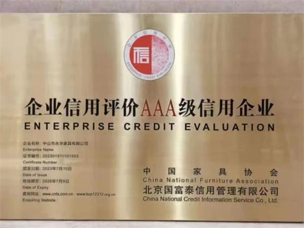 中山永華家具被評(píng)為“企業(yè)信用評(píng)價(jià)AAA級(jí)信用企業(yè)”