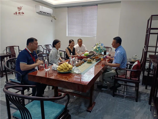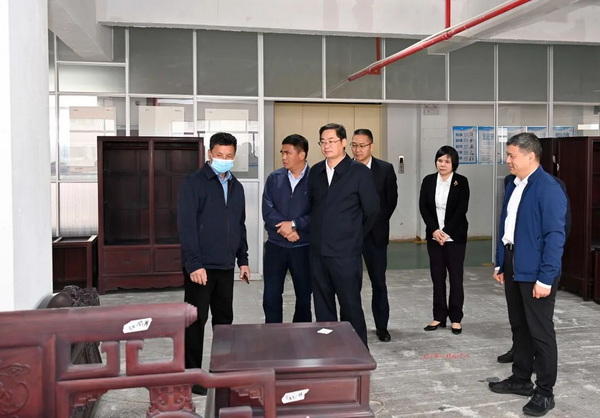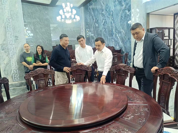 東陽市市長黃勝可(右二)一行與董事長陸飛躍(左三)參觀喜迎紅紅木展廳
