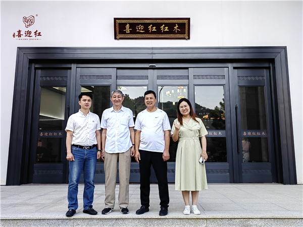 全聯(lián)藝術(shù)紅木家具專業(yè)委員會專家顧問、故宮博物院文??萍疾吭魅尾莒o樓(左二),全聯(lián)藝術(shù)紅木家具專業(yè)委員會執(zhí)行會長、品牌紅木創(chuàng)始人、CEO林偉華(左一),喜迎紅紅木董事長陸飛躍(右二)合影