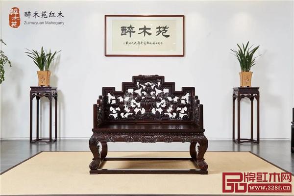 醉木苑《紫檀卷草紋寶座》,是復(fù)刻清中期寶座的典型代表。此寶座精致的雕刻裝飾,是清代融合中西方藝術(shù)風(fēng)格和設(shè)計特色的成功范例。