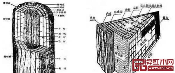 每一年輪是由兩部分木材組成。樹干中靠近髓心一側(cè),樹木每年生長季節(jié)早期形成一部分木材稱為“早材”;而靠近樹皮一側(cè),樹木每年生長后期形成的一部分木材稱為“晚材”。