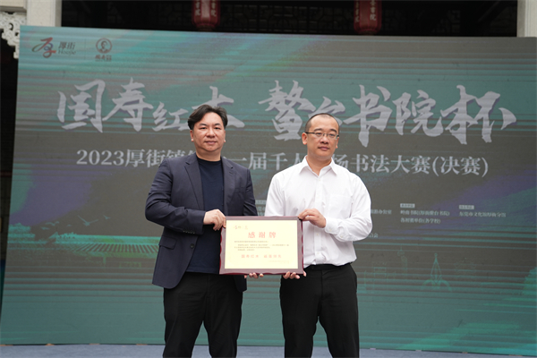 厚街鎮(zhèn)宣傳教育文體旅游辦公室主任、厚街鎮(zhèn)文學(xué)藝術(shù)界聯(lián)合會常務(wù)副主席王國榆為國壽紅木頒授感謝牌
