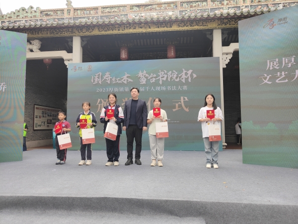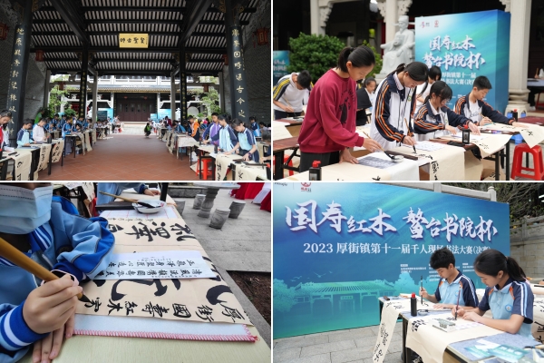 2023年11月13日上午,由東莞市鴻普軒家具有限公司(國壽紅木)冠名,厚街鎮(zhèn)宣傳教育文體旅游辦公室、厚街鎮(zhèn)教育管理中心、厚街鎮(zhèn)文化服務(wù)中心、厚街鎮(zhèn)文學(xué)藝術(shù)界聯(lián)合會共同主辦,嶺南書院(鰲臺書院)及各初賽學(xué)校承辦的“國壽紅木·鰲臺書院杯”2023厚街鎮(zhèn)第十一屆千人現(xiàn)場書法大賽決賽暨頒獎儀式在嶺南書院(鰲臺書院)舉行,這座500多年歷史、“三甲留墨”的古書院里,來自全鎮(zhèn)高校和各中、小學(xué)校的學(xué)生現(xiàn)場揮毫潑墨,切磋書法技藝,傳承發(fā)展傳統(tǒng)文化,展現(xiàn)厚街文化強鎮(zhèn)建設(shè)新氣象。