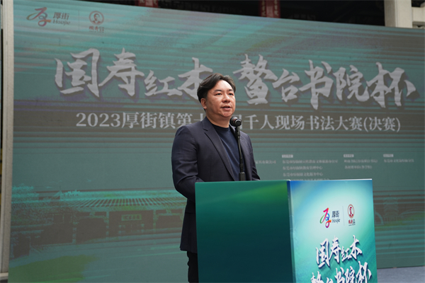 國壽紅木總經(jīng)理陳衛(wèi)棠在“2023厚街鎮(zhèn)第十一屆千人現(xiàn)場書法大賽決賽”頒獎儀式上發(fā)表致辭