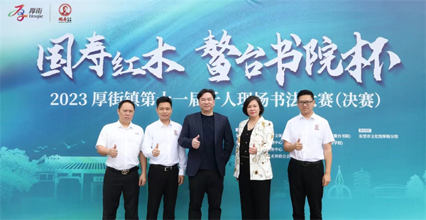 國壽紅木總經(jīng)理陳衛(wèi)棠(左三)、藝術(shù)總監(jiān)陳映雄(右二)、營銷總監(jiān)袁利平(左二)、國壽紅木營銷總監(jiān)陳錦寧(左一)、國壽紅木藝術(shù)館館長謝江龍(右一)在“國壽紅木·鰲臺書院杯”2023厚街鎮(zhèn)第十一屆千人現(xiàn)場書法大賽決賽現(xiàn)場合影留念