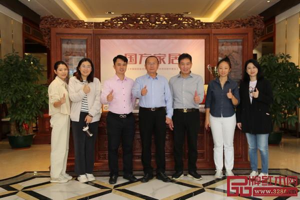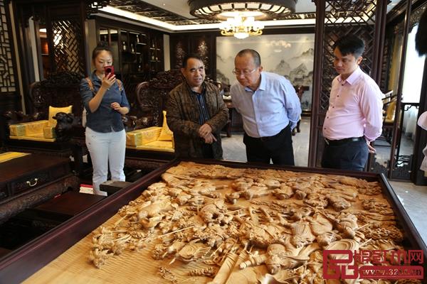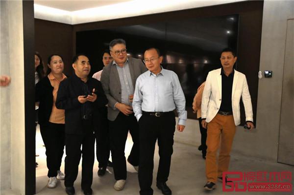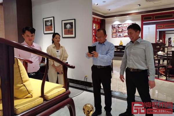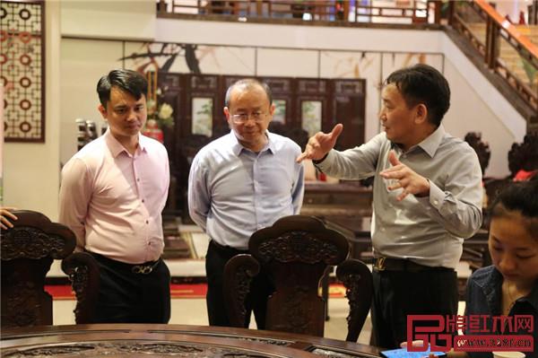走進國方家居,周京南研究員一行在國方家居董事長陳新平的陪同下,參觀國方家居大紅酸枝家具展廳和紅木工藝整裝樣板間。