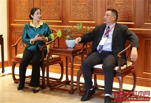 △ 美國中山總商會會長劉春明先生(右)與國方家居副總經(jīng)理胡秀英女士(左)深度交流