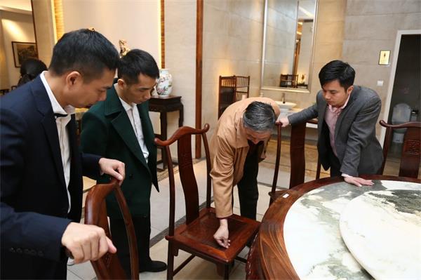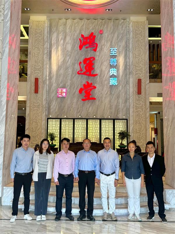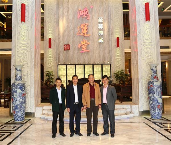 原故宮博物院文??萍疾恐魅尾莒o樓(右二)到訪鴻運堂,全聯(lián)藝術紅木家具專業(yè)委員會執(zhí)行會長林偉華(右一)、鴻運堂總經(jīng)理蕭耀能(左二)熱情接待并陪同參觀