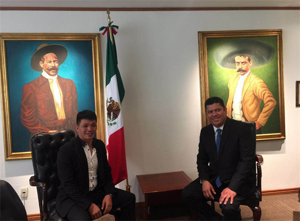 萬事紅紅木總經(jīng)理蔣龍與墨西哥當?shù)仡I(lǐng)導(dǎo)合照