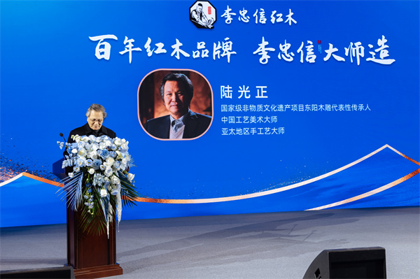 在2023中信紅木品牌戰(zhàn)略發(fā)展大會(huì)上,國家級(jí)非物質(zhì)文化遺產(chǎn)項(xiàng)目東陽木雕代表性傳承人、中國工藝美術(shù)大師、亞太地區(qū)手工藝大師陸光正發(fā)表致辭,以下為陸光正大師的致辭整理(內(nèi)容有刪減):