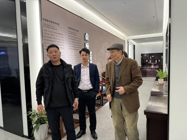 全聯(lián)藝術(shù)紅木家具專業(yè)委員會(huì)專家顧問(wèn)、故宮博物院文保科技部原主任曹靜樓(右)與全聯(lián)藝術(shù)紅木家具專業(yè)委員會(huì)執(zhí)行會(huì)長(zhǎng),品牌紅木CEO林偉華(中)在鼎順紅木董事長(zhǎng)蔣國(guó)順的陪同下參觀展廳