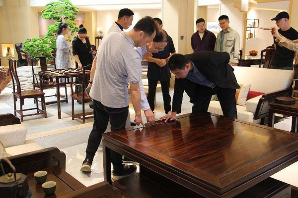 東陽(yáng)市微凹傳祺董事長(zhǎng)金飛來(lái)帶領(lǐng)到會(huì)人員參觀了微凹傳祺家具藝術(shù)館,向大家介紹了微凹黃檀的特色與魅力。