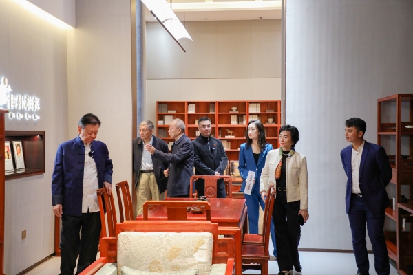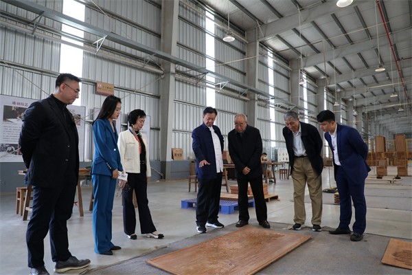 故宮博物院文??萍疾吭魅尾莒o樓(右二),《紅木家具通用技術(shù)條件》標(biāo)準(zhǔn)主要起草人曹新民(右三),全國(guó)工商聯(lián)藝術(shù)紅木家具專業(yè)委員會(huì)執(zhí)行會(huì)長(zhǎng)、《大國(guó)匠心&大國(guó)工廠》欄目策劃人、品牌紅木CEO林偉華(右一),與中國(guó)傳統(tǒng)工藝大師、國(guó)壽紅木創(chuàng)始人陳國(guó)壽(右四),國(guó)壽紅木創(chuàng)始人夫人倫群章(左三),國(guó)壽紅木董事長(zhǎng)陳淦凡(左一)與央視主持人(左二)參觀國(guó)壽紅木湖北現(xiàn)代化觀光工廠