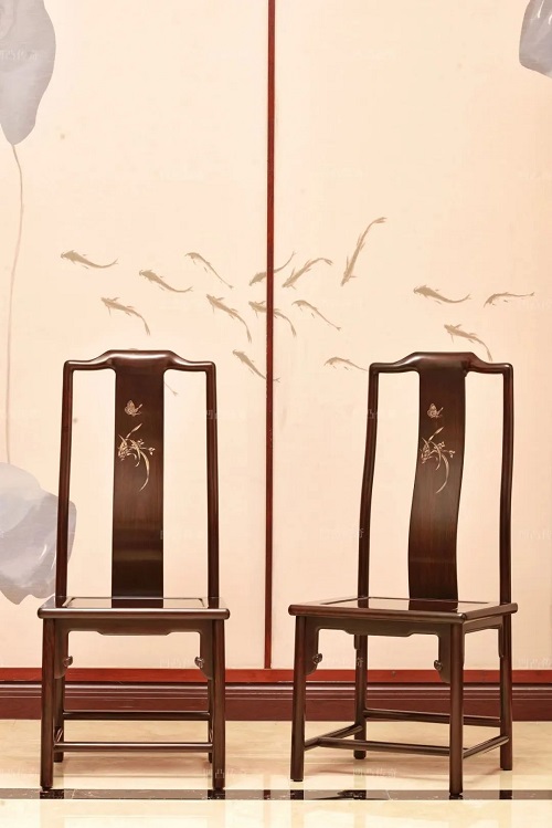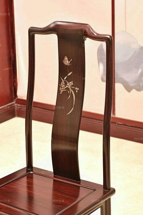 餐椅背板用蘭花、蝴蝶為題材,展現(xiàn)出一幅生動(dòng)活潑的畫(huà)面。蘭花枝條輕盈飄逸,蝴蝶穿梭其中,形態(tài)栩栩如生。雕刻的點(diǎn)綴為整個(gè)圓桌增添了濃厚的自然氣息和生命力。