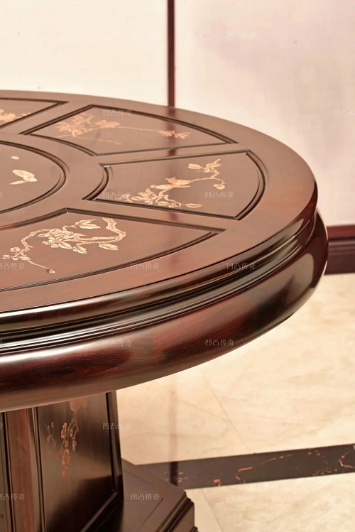 精美的雕刻、舒適的坐感、人性化的設(shè)計(jì)以及珍稀木材的選用都彰顯了其高品質(zhì)和精致工藝。《影雕戧金圓桌》不僅是一款實(shí)用的餐桌家具,更是一件充滿藝術(shù)價(jià)值和收藏價(jià)值的工藝品。