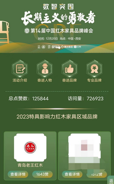 老王紅木首次參評(píng)便以線上投票第一名的成績(jī)斬獲大獎(jiǎng),足見(jiàn)其市場(chǎng)口碑和品牌實(shí)力
