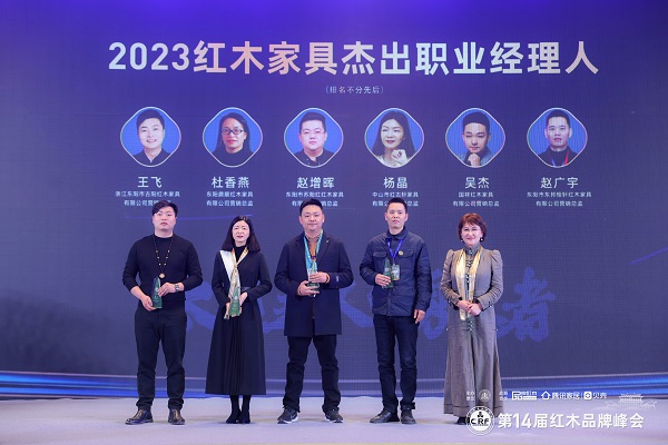 紅古軒營銷總監(jiān)楊晶(左二)榮獲“2023紅木家具杰出職業(yè)經(jīng)理人”