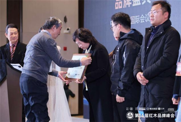 恒藝中式家居陶凱龍總經(jīng)理(右一)上臺領(lǐng)獎,全聯(lián)藝術(shù)紅木家具專業(yè)委員會專家顧問、故宮博物院文??萍疾吭魅尾莒o樓頒獎