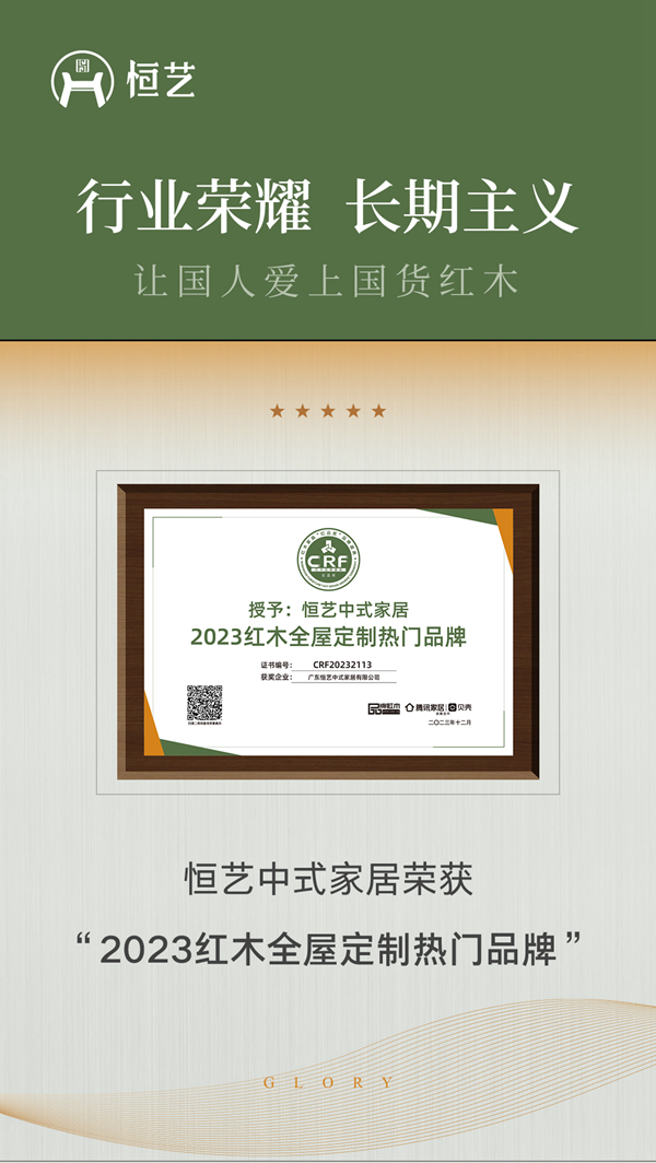 恒藝中式家居榮獲“紅木全屋定制熱門品牌”