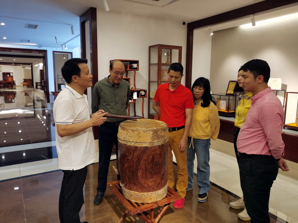 林慶財(cái)大師親自為兩位來賓導(dǎo)覽,他如數(shù)家珍地介紹著每一件海南黃花梨家具背后的文化與故事。在這座藝術(shù)的殿堂中,最引人注目的莫過于那尊中國最大的黃花梨鼓。據(jù)林大師介紹,這面鼓的鼓體是由上千年樹齡的海南黃花梨精心雕琢而成。歷經(jīng)滄桑,黃花梨鼓仿佛訴說著古老的故事。