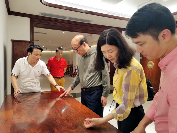 兩位來賓欣賞著獨(dú)板的海南黃花梨家具,他們被林慶財(cái)大師精湛的工藝所折服,紛紛為其點(diǎn)贊。林慶財(cái)大師對(duì)黃花梨的熱愛與堅(jiān)持,如同璀璨的繁星,引領(lǐng)著業(yè)界前行,成為無數(shù)人心中的楷模。