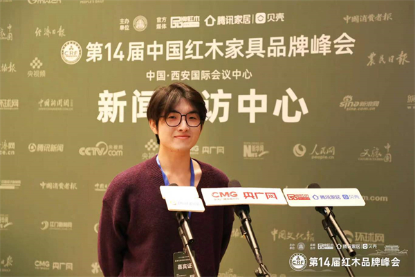 旭東紅木第六代傳承人李天成在峰會現場接受媒體采訪。