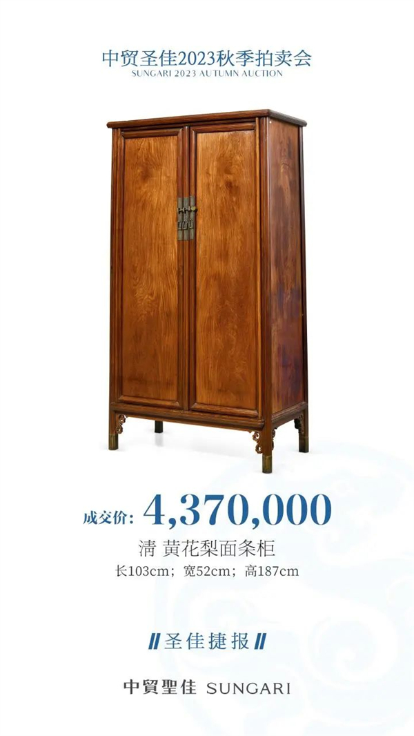 “古董珍玩專場”斬獲52,528,550元成交額,其中,“斫木”表現(xiàn)平穩(wěn),獲不俗成績,六件紅木家具成交總額為1334萬元,清代黃花梨面條柜成交價為4,370,000元,為本場拍賣的紅木家具中最高價。