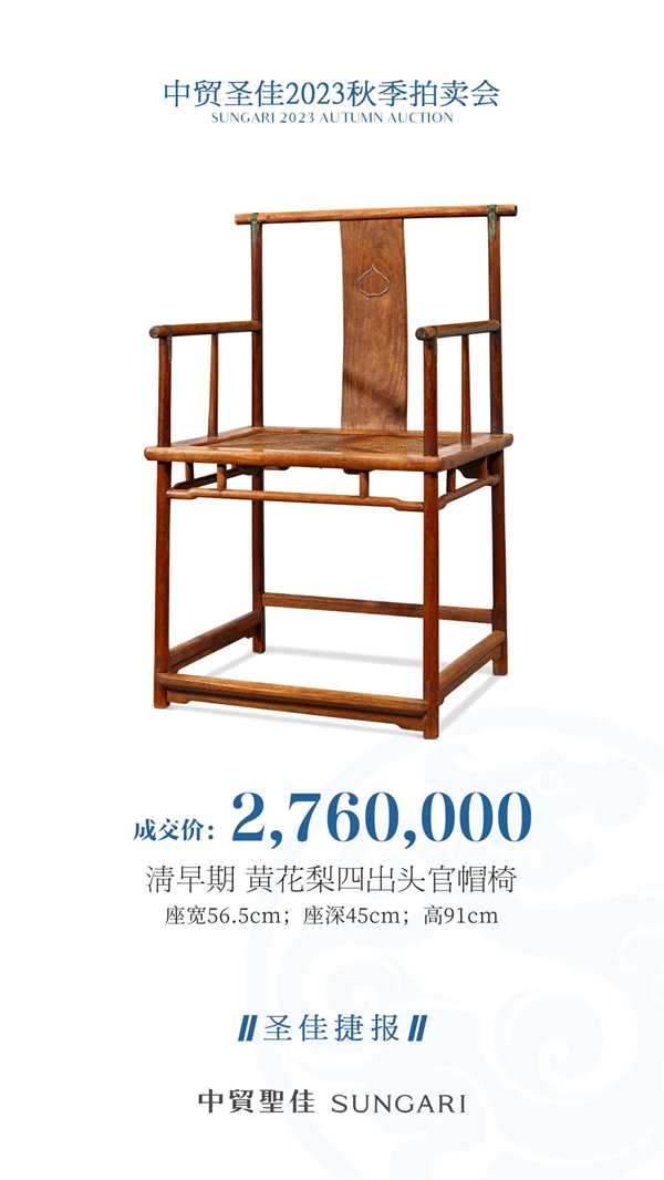 清早期黃花梨四出頭官帽椅成交價為2,760,000元。