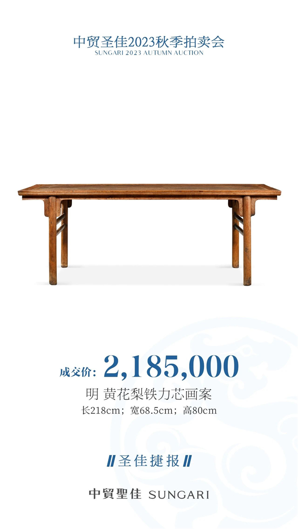 明代黃花梨鐵力芯畫案成交價為2,185,000元。