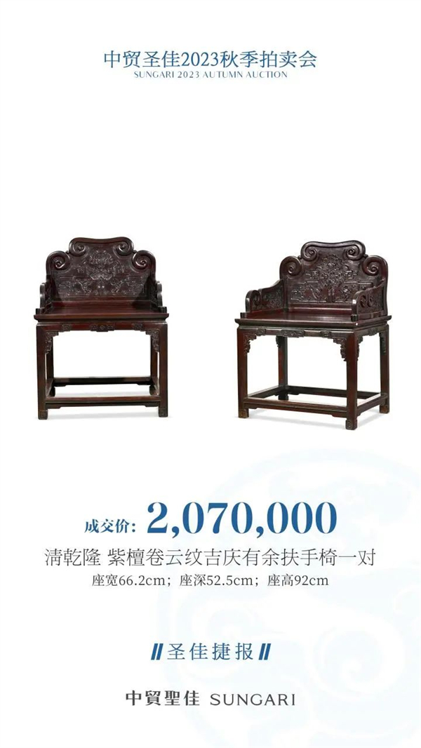 清乾隆時期紫檀卷云紋吉慶有余扶手椅一對成交價為2,070,000元。