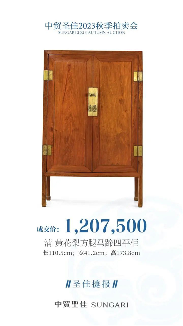 清代黃花梨方腿馬蹄四平柜成交價為1,207,500元。