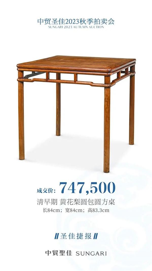 清早期黃花梨圓包圓方桌成交價為747,500元。