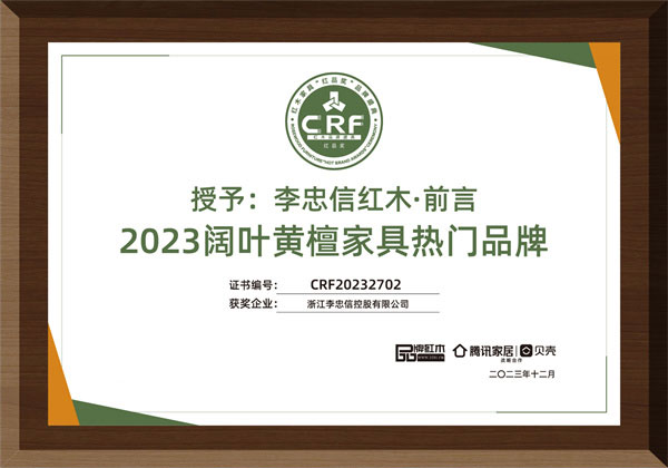 李忠信紅木蟬聯(lián)“紅木家具十大影響力品牌”、“闊葉黃檀家具熱門品牌”、“全屋定制熱門品牌”