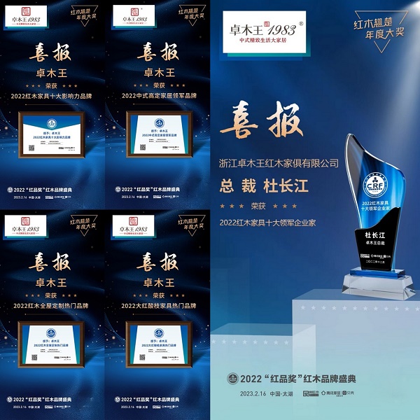 2月16日,主題為“守正創(chuàng)新 奮進紅木新征程”的第13屆中國紅木家具品牌峰會于在蘇州太湖國際會議中心圓滿舉行,同期舉行了CRF“紅品獎”紅木品牌盛典,卓木王憑借領(lǐng)先的商業(yè)模式和多維度專業(yè)服務能力,斬獲年度“紅木家具十大影響力品牌”“十大領(lǐng)軍企業(yè)家”“中式高定家居領(lǐng)軍品牌”“紅木全屋定制熱門品牌”“大紅酸枝家具熱門品牌”五項大獎。