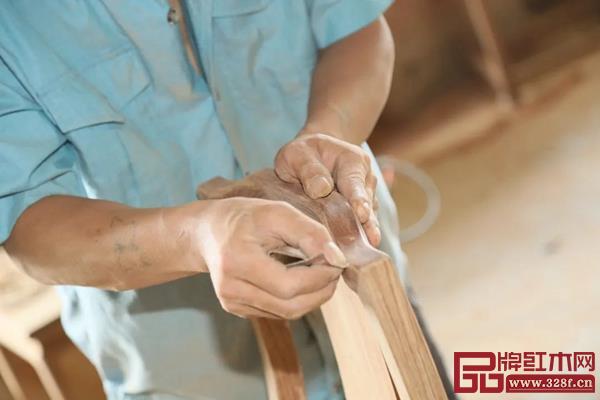 除了榫卯工藝,雄業(yè)·本木上造的刮磨技藝也值得一提。打磨師傅無數(shù)次的打磨,呈現(xiàn)出平滑、有質(zhì)感、富有層次的效果。每一個紋理和質(zhì)感的細(xì)微變化都顯示出無與倫比的細(xì)致處理和深厚的技術(shù)功底。