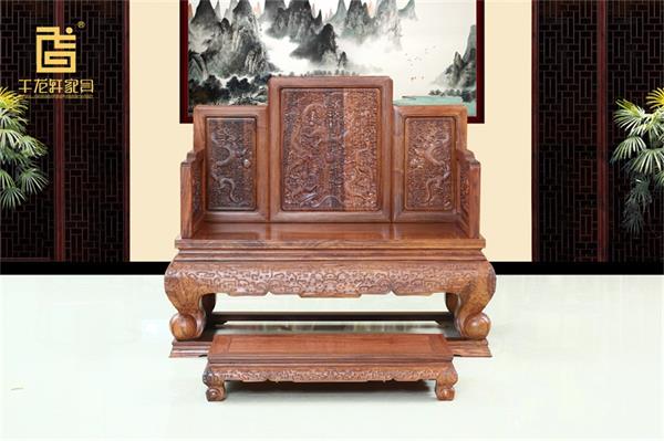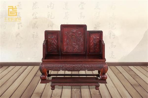 在明清時期,由于寶座是統(tǒng)治階級專用的坐具,一般選料巨大,用料考究,多為小葉紫檀或大紅酸枝。在很多的寶座上還應用了大量的雕刻,尤其是在清式寶座中更是突出。