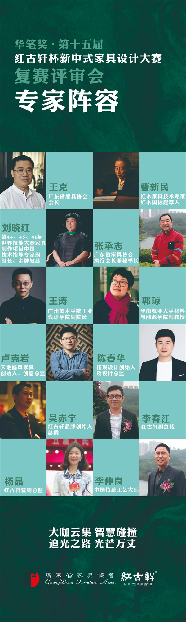 大會上,廣東省家具協(xié)會會長王克;廣東省家具協(xié)會執(zhí)行會長兼秘書長張承志;紅木家具技術(shù)專家、紅木國標起草人曹新民;第44、45、46屆世界技能大賽家具制作項目中國技術(shù)指導專家組組長、金牌教練劉曉紅;廣州美術(shù)學院工業(yè)設(shè)計學院副院長王濤;華南農(nóng)業(yè)大學材料與能源學院副教授郭瓊;拓璞設(shè)計公司創(chuàng)始人及設(shè)計總監(jiān)陳春華;天地儒風家具創(chuàng)始人、創(chuàng)意總監(jiān)盧克巖;紅古軒品牌創(chuàng)始人、總裁吳赤宇;紅古軒副總裁李春江;中國傳統(tǒng)工藝大師李仲良;紅古軒營銷總監(jiān)楊晶共同組成評審團,共同評審第十五屆“紅古軒杯”復賽作品。