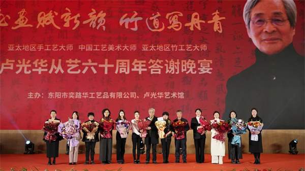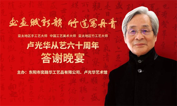 2024年1月6日,書畫賦新韻 竹道寫丹青——盧光華從藝六十周年答謝晚宴在東陽天瀾雷迪森廣場酒店隆重舉行。國務(wù)院參事室特邀研究員、中國勞動(dòng)學(xué)會(huì)會(huì)長楊志明、中國工藝美術(shù)協(xié)會(huì)常務(wù)副會(huì)長張紅、浙江省政協(xié)原副主席陳加元、國家文物局原常務(wù)副局長張柏、浙江省人大常委會(huì)原副主任葉榮寶等各級領(lǐng)導(dǎo)、亞太地區(qū)手工藝大師、中國手工藝美術(shù)大師等眾多大師、社會(huì)各界人士及親朋好友七百余人參加了本次晚宴。