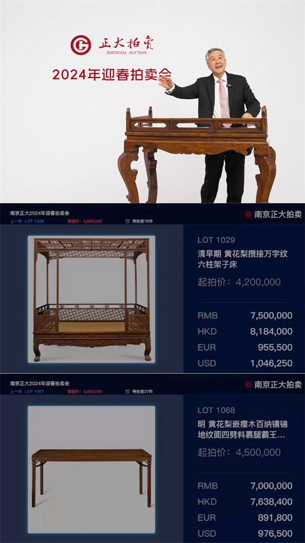 1月15日,南京正大2024年迎春拍賣(mài)會(huì)正式舉槌,經(jīng)過(guò)兩個(gè)多小時(shí)的激烈競(jìng)爭(zhēng),以總成交額1.1億元的成績(jī)圓滿(mǎn)收官。其中,紅木家具藏品總成交額為5469萬(wàn)元。