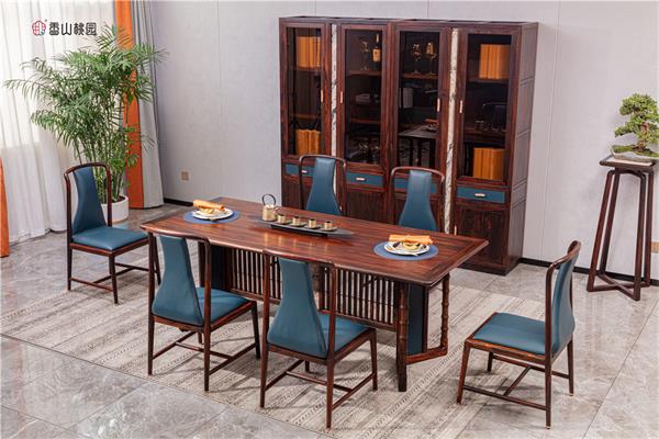 一張構(gòu)造細(xì)膩、紋理明晰的黑酸枝長(zhǎng)桌,與新中式茶空間相得益彰,展現(xiàn)出時(shí)尚與舒適并存的特點(diǎn)。