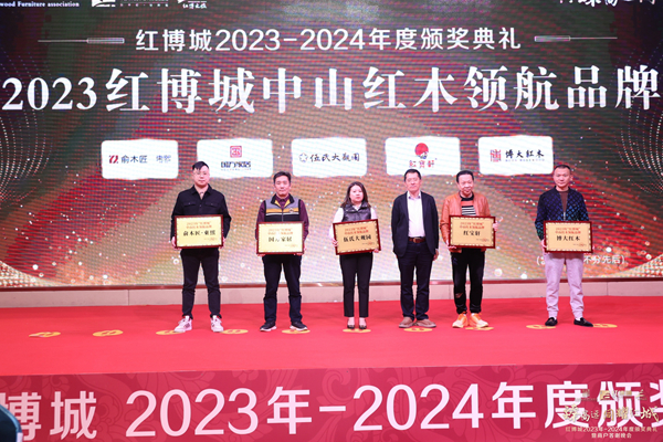 在頒獎典禮上,首先頒發(fā)的是2023年“紅博城”中山紅木領(lǐng)航品牌,共有5個品牌獲此殊榮。獲獎品牌代表上臺領(lǐng)獎,紅博城運(yùn)營總監(jiān)張力上臺頒獎并贈予牌匾。