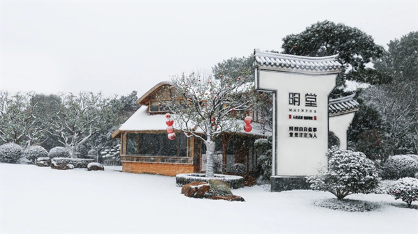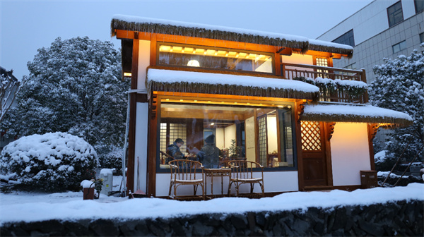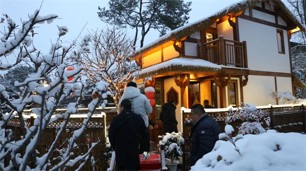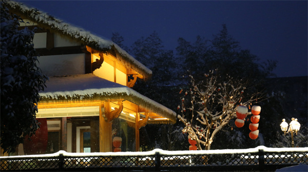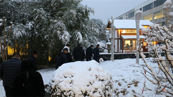 陸曉亮一行剛出思想館,就被夜色中的明堂·斗方吸引住了目光,紛紛拿出手機記錄下美好一刻。下了一天的雪,讓半掩在雪景里的斗方更顯溫馨、雅致。