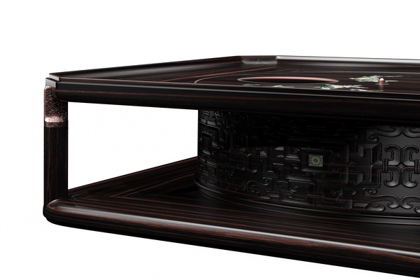 觀堂茶幾2.0作品,在原造型基礎(chǔ)上增加四面箱體,整體造型四平八穩(wěn),增加儲(chǔ)物功能,采用全奢石面板,外框沿用皇室海濤紋,及央璽獨(dú)家系列卷草紋,用現(xiàn)代手筆,描摹東方生活的靜與動(dòng)。