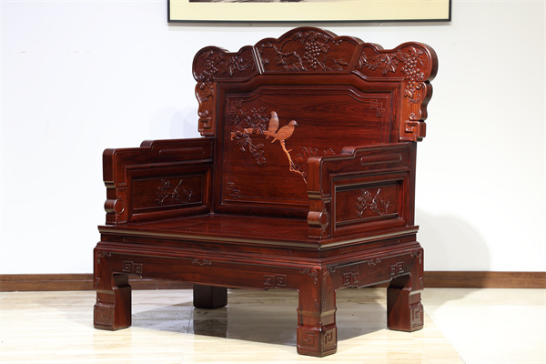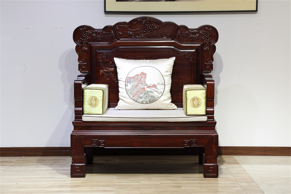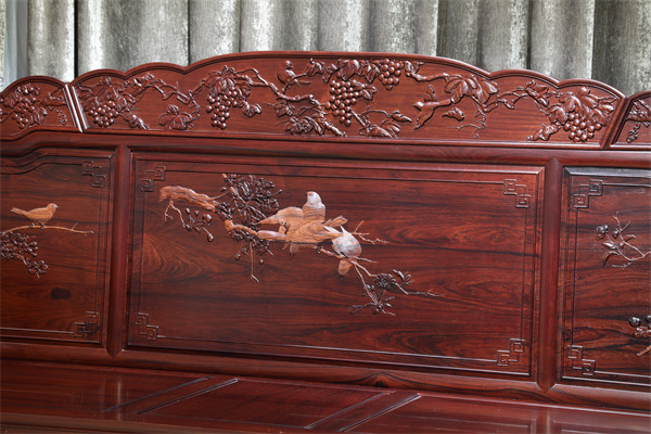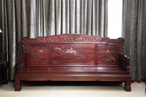 沙發(fā)的搭腦上,葡萄藤蔓蜿蜒纏繞,栩栩如生,仿佛能聞到那淡淡的果香;花卉綻放其中,花瓣層疊,細(xì)膩入微,猶如花叢中的一抹亮色。
