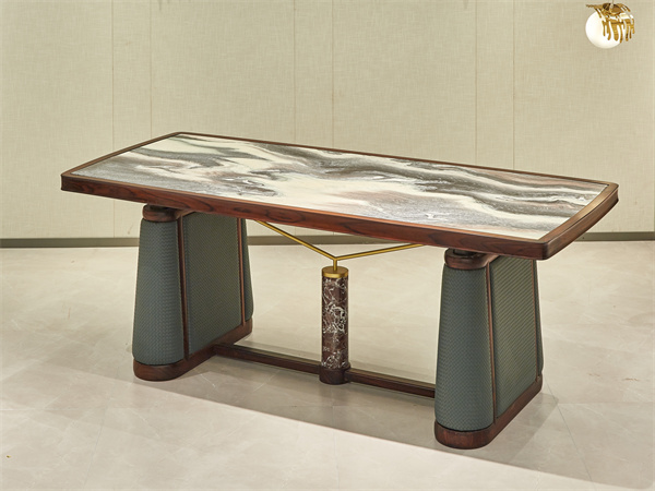 《岳納餐桌》作為餐廳中的核心元素,承載著一家人的團(tuán)聚與歡樂,為餐廳帶來一份精致與舒適。它采用闊葉黃檀木與大理石混搭,給人一種時(shí)尚潮奢的感覺,與新年氛圍相得益彰。