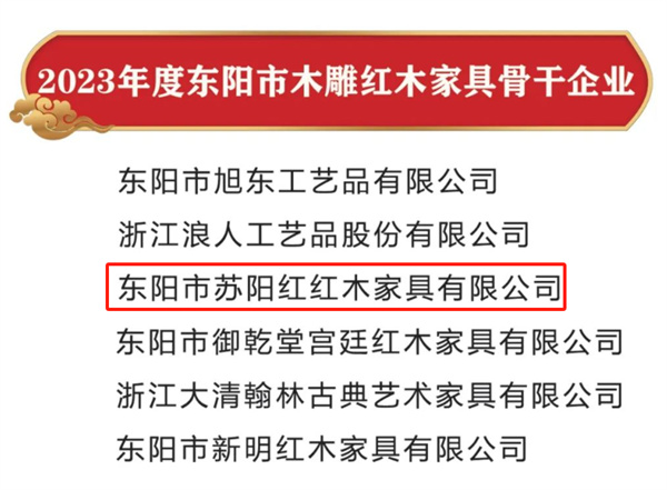 蘇陽紅紅木被授予“東陽市木雕紅木家具骨干企業(yè)”稱號(hào)