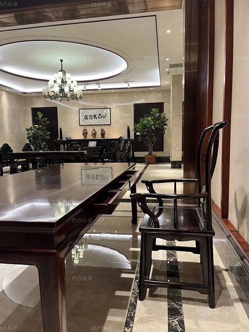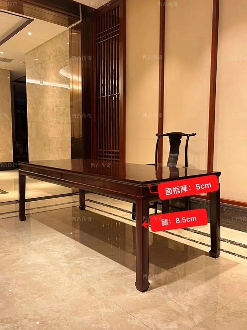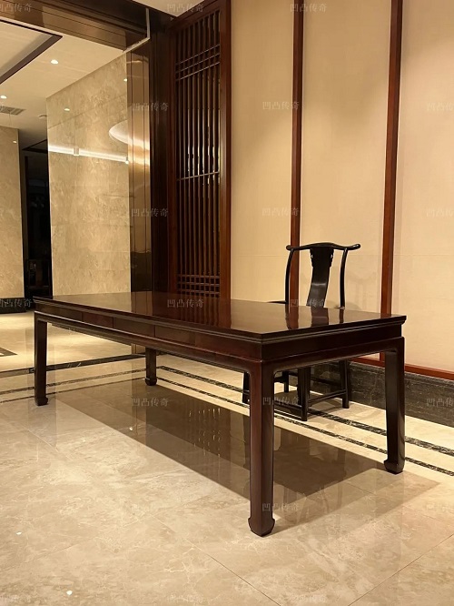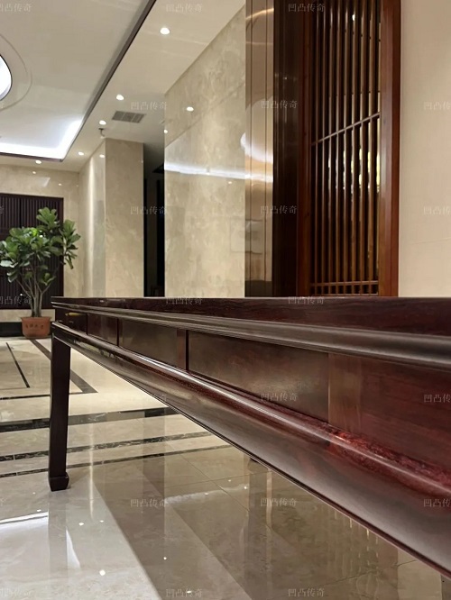 桌子整體采用小葉紫檀制作而成,色澤深邃華麗,在光線的照射下,它的紋理清晰可見,仿佛是一幅流動的畫卷。